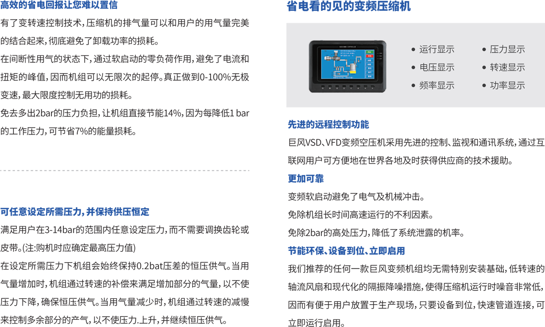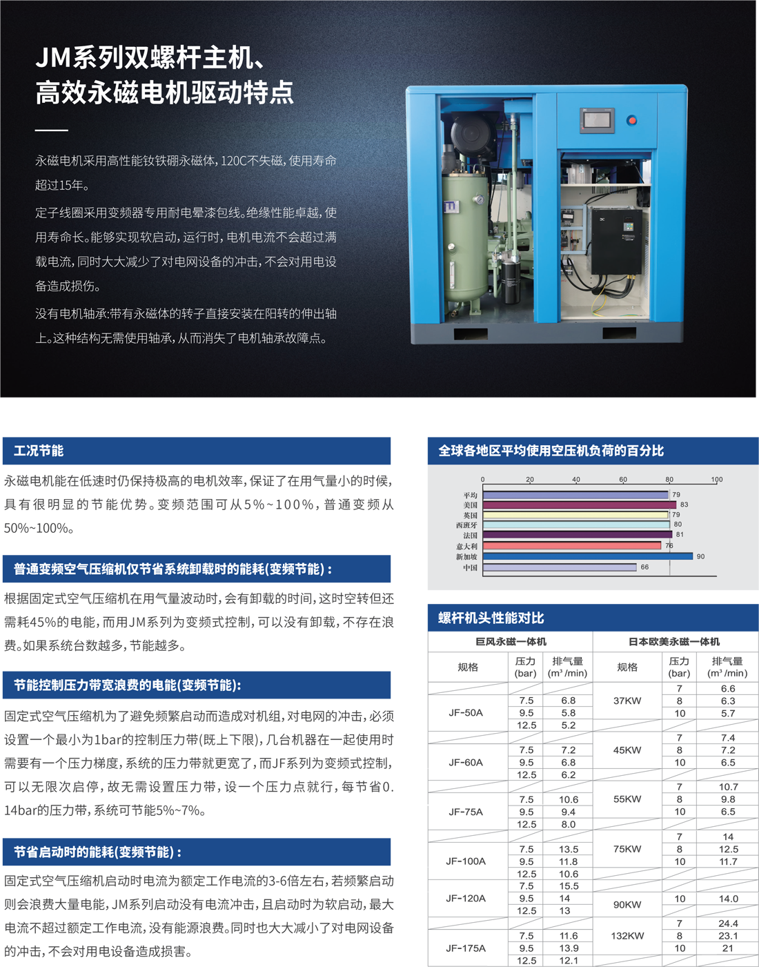 巨风永磁机型 巨风变频空气压缩机、全球同步,让更多的中国用户感受省电带来的喜悦: 1、先进的全变频结构、变频系统; 2、只需单点电气连接; 3、无能量损失; 4、和变频电机相连、高效率、长寿命; 5、工变频两用机型; 产品参数 返回顶部